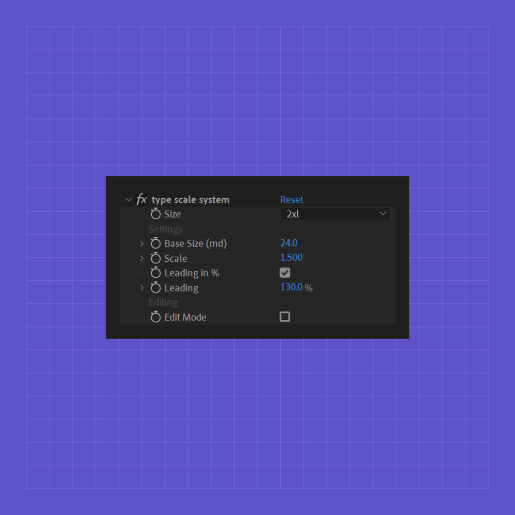 Type Scale System is a powerful preset that brings the benefits of type scales to AE, all at your fingertips thanks to its intuitive controls. Simply specify the system parameters on one layer, then link the other layers to it while adjusting their size individually. This allows you to make global changes effortlessly.